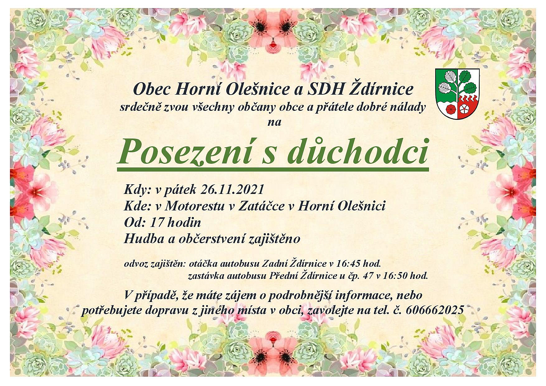 Obec Horní Olešnice a SDH Ždírnice srdečně zvou všechny občany obce a přátele dobré nálady na přátelské posezení. Pro všechny účastníky je odvoz zajištěn.