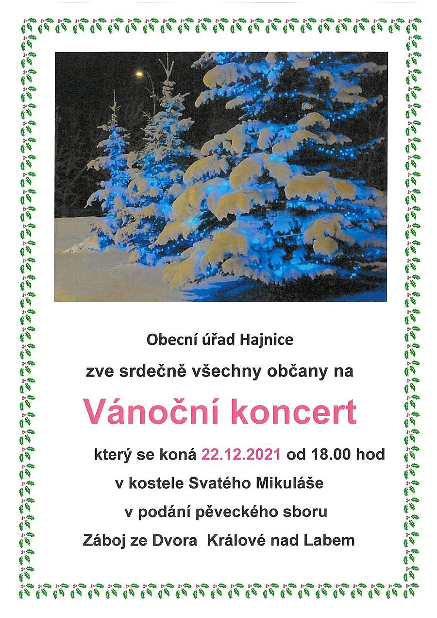 Obecní úřad Hajnice zve srdečně všechny občany na Vánoční koncert 22. 12. 2021 do kostela sv. Mikuláše. Vystoupí pěvecký sbor Záboj ze Dvora Králové nad Labem.