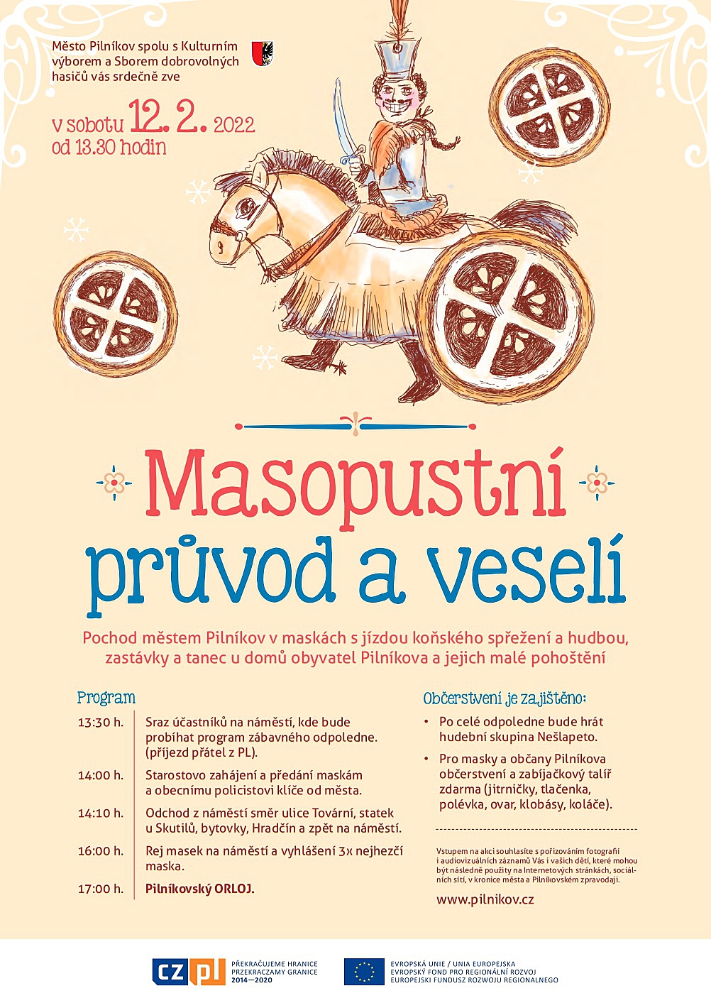 Město Pilníkov, KV a SDH srdečně zve na Masopustní průvod a veselí. Pro masky a obyvatelé Pilníkova občerstvení zdarma - jitrničky, zabijačkový talíř, ovar, koláče..