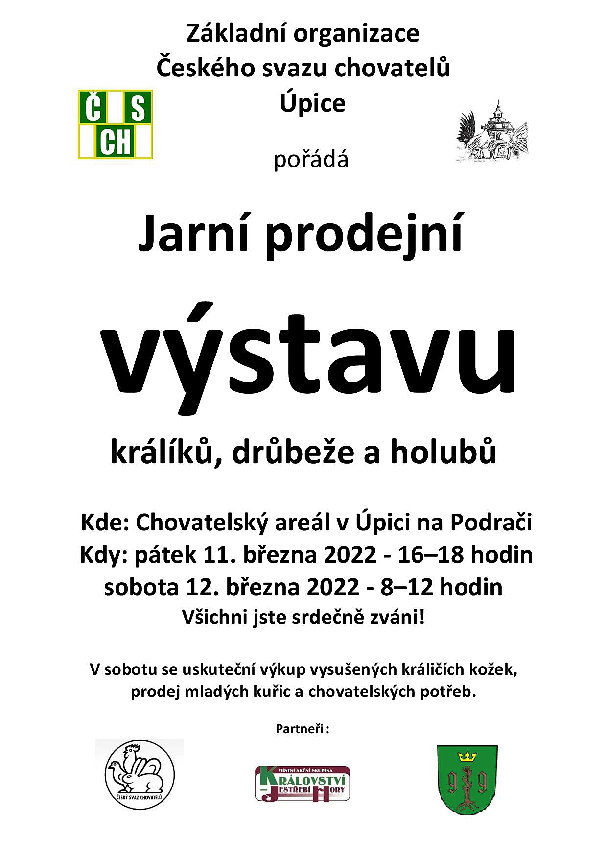 Chovatelé z Úpicka vás zvou na jarní výstavu králíků, drůbeže a holubů do chovatelského areálu v Úpici na Podrači. Výstava bude otevřena v pátek 11. 3. od 16:00 do 18:00 a v sobotu 12. 3. od 8:00 do 11:30. Při výstavě bude možné zakoupit chovná zvířata pro letošní sezónu včetně kuřic. Těšíme se na vás.