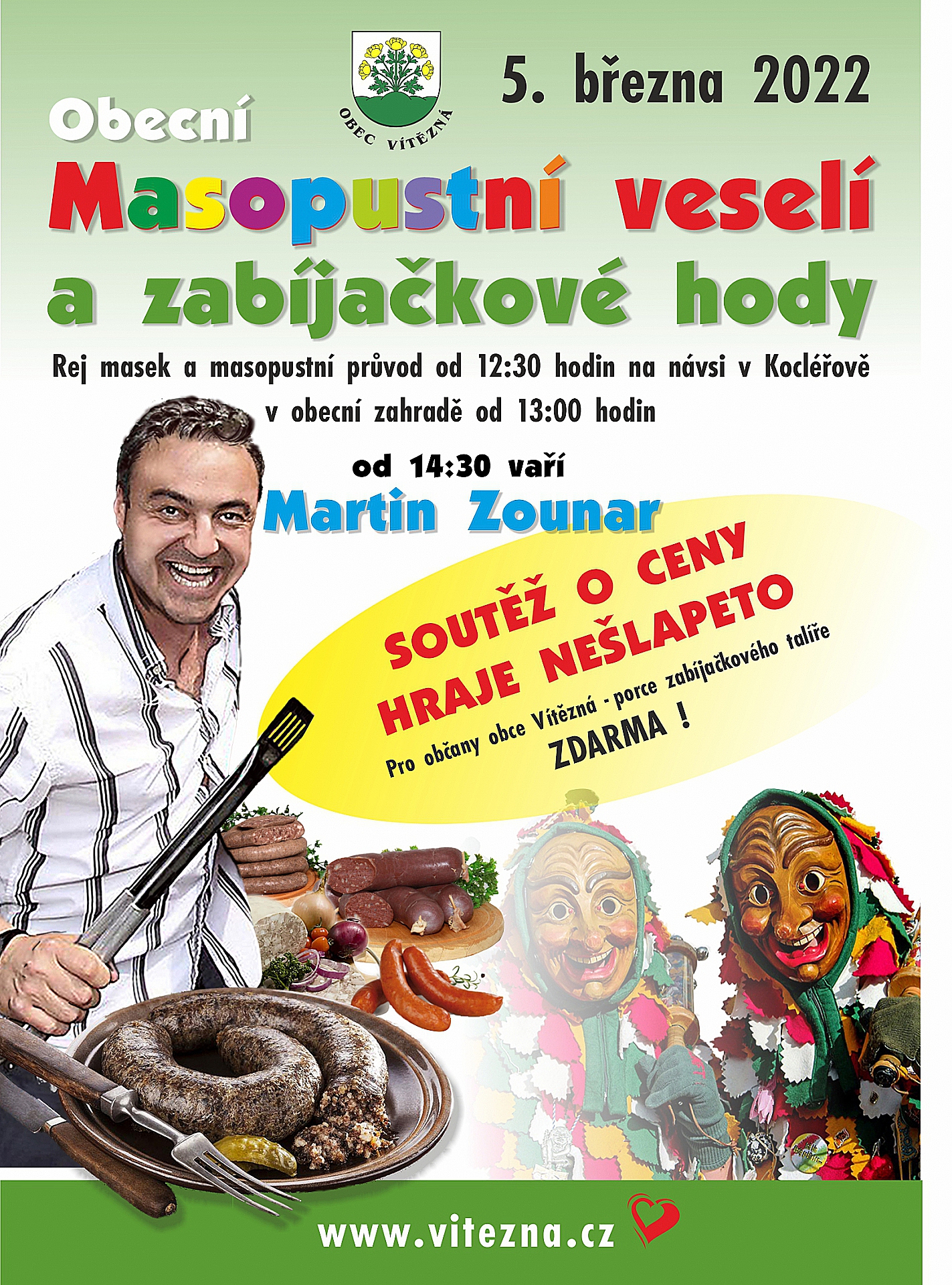 Rej masek, masopustní průvod, pro občany Vítězné porce zabíjačkového talíře zdarma! Součástí akce bude soutěž o ceny, hraje Nešlapeto. Více na www.vitezna.cz.