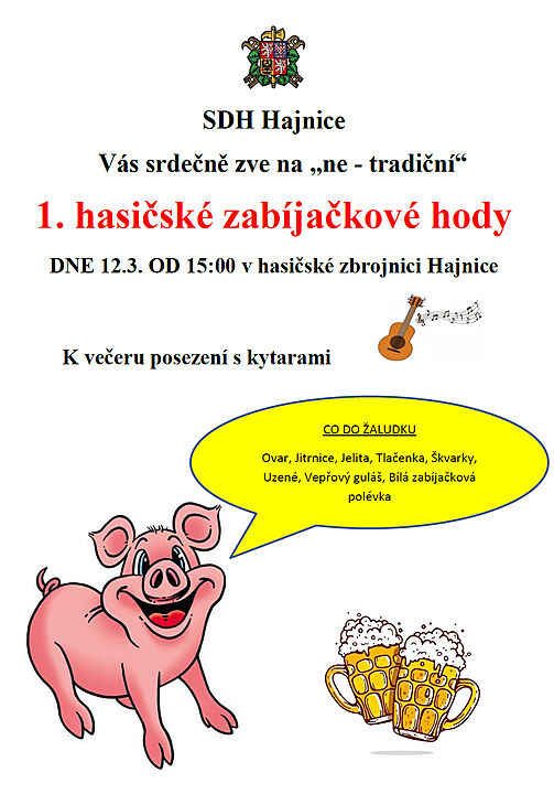 V sobotu 12. 3. 2022 od 15 hodin pořádá SDH Hajnice akci s názvem 1. hasičské zabíjačkové hody. Zváni jsou všichni ti, kteří chtějí prožít večer s kytarou a vychutnat si atmosféru tradiční zabijačky s ochutnávkou zabijačkových specialit.