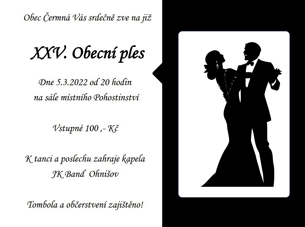Obec Čermná vás srdečně zve na XXV. Obecní ples, který se bude konat 5. března od 20 hod. na sále místního Pohostinství.