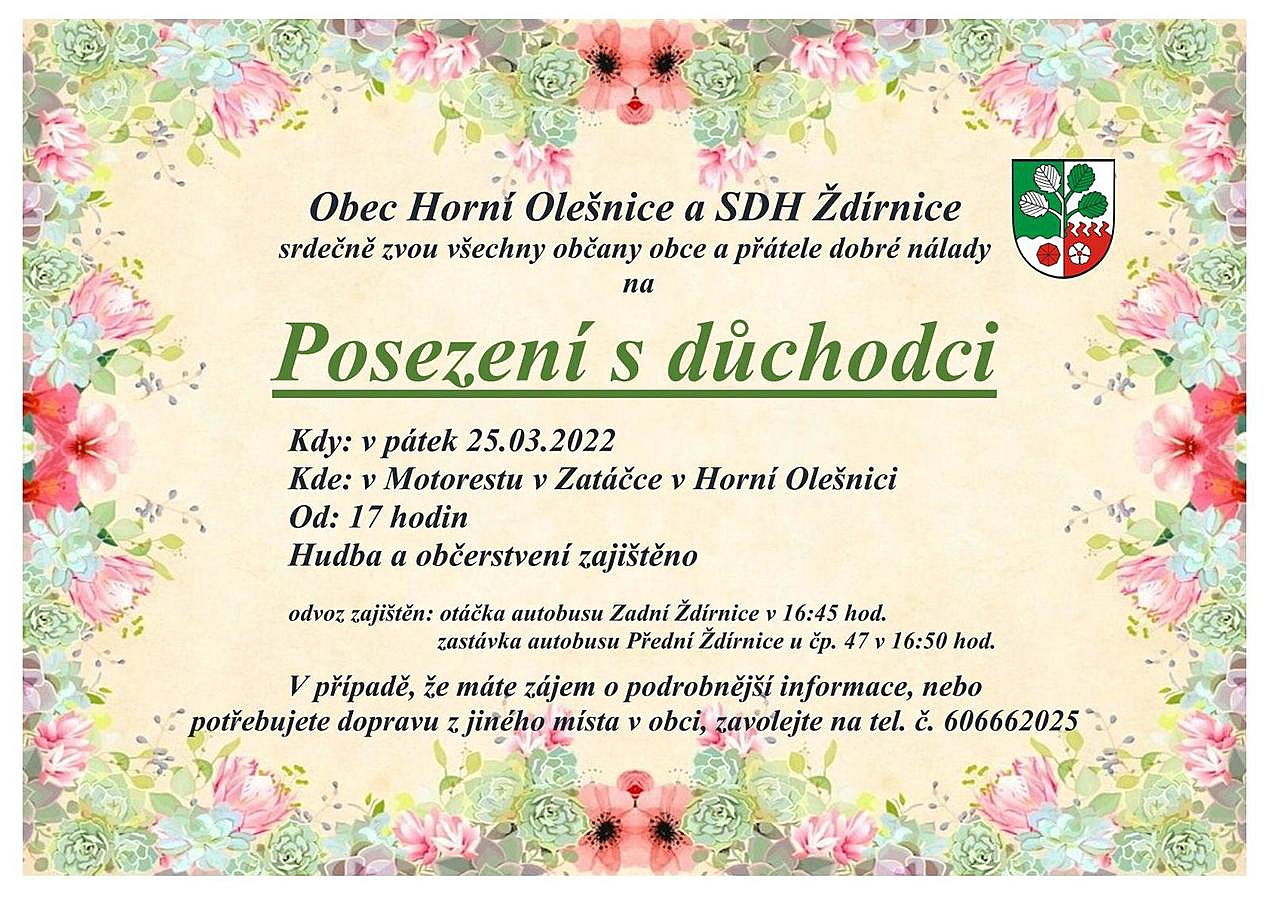 Obec Horní Olešnice a SDH Ždírnice srdečně zvou všechny občany obce a přátele dobré nálady na přátelské posezení. Pro všechny účastníky je odvoz zajištěn.