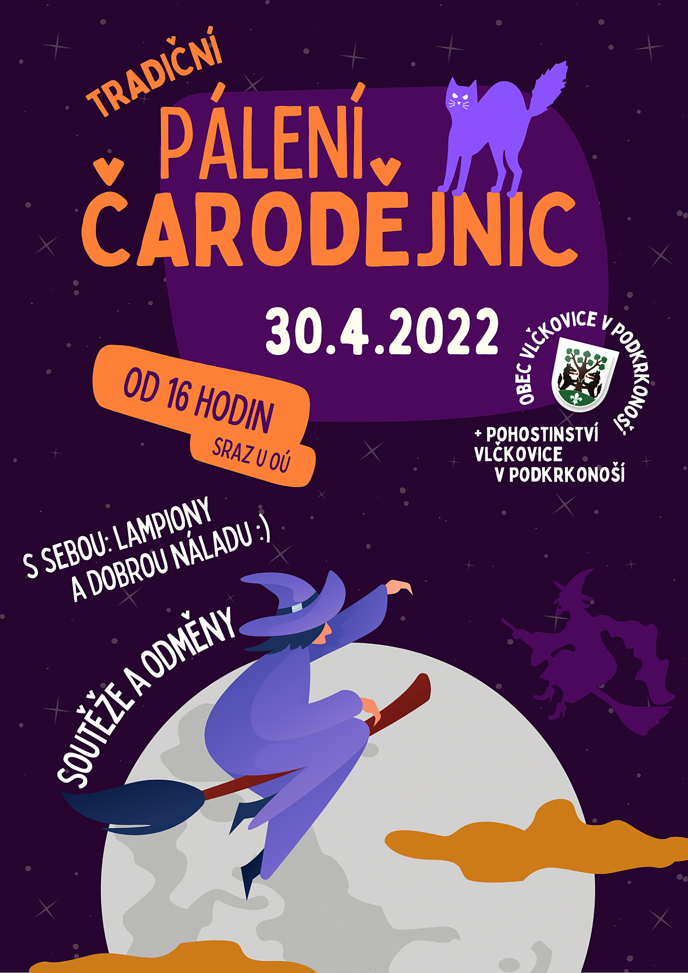 Poslední dubnovou sobotu pořádáme každoroční čarodějnický rej. Na děti bude čekat stezka s úkoly, soutěžemi a odměnami. Taktéž i tradiční opékání špekáčků, lampionový průvod atd. :) Začátek u OÚ ve Vlčkovicích v Podkrkonoší.