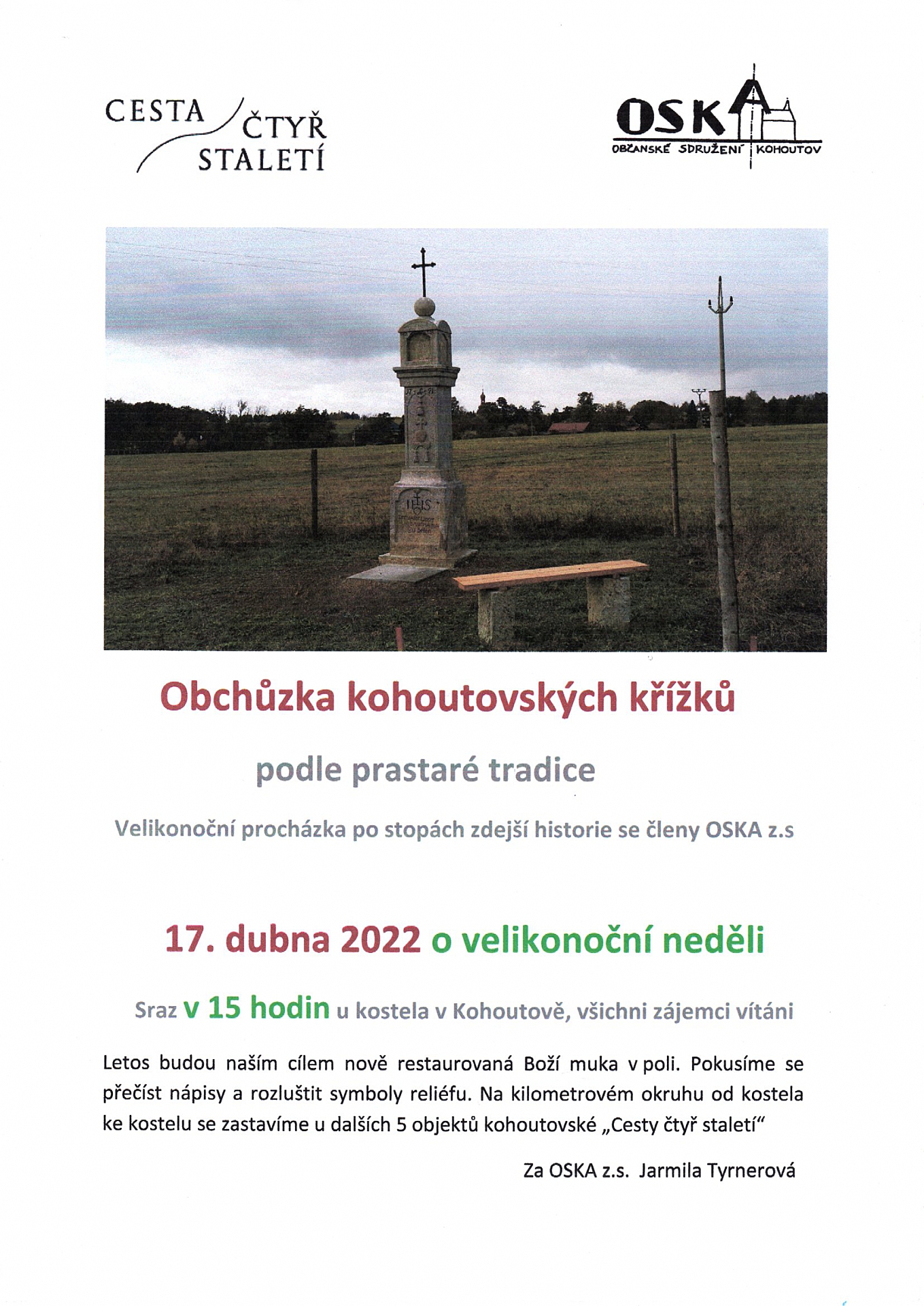 Obec kříže opravuje a doplňuje informačními dlaždicemi, nejstarší pochází z roku 1721. Odtud název celé Cesty čtyř staletí. Letos budou cílem nově zrekonstruovaná Boží muka v poli.