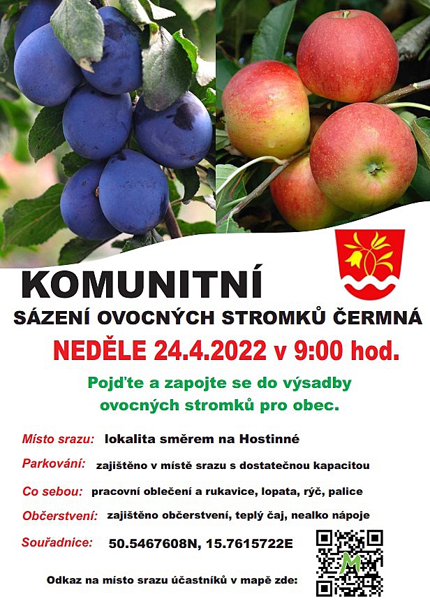 Komunitní výsadba ovocných stromků v lokalitě směrem na Hostinné proběhne v sobotu 24. 4. 2022. Vysazené stromy přispějí k zadržení vody v krajině, zpomalí nebo zabrání erozi půdy v terénu a vytvoří i dobré prostředí pro život a migraci živočichů. Kdo chcete strávit dopoledne v přírodě a přispět ke zlepšení životního prostředí, jste vítáni.