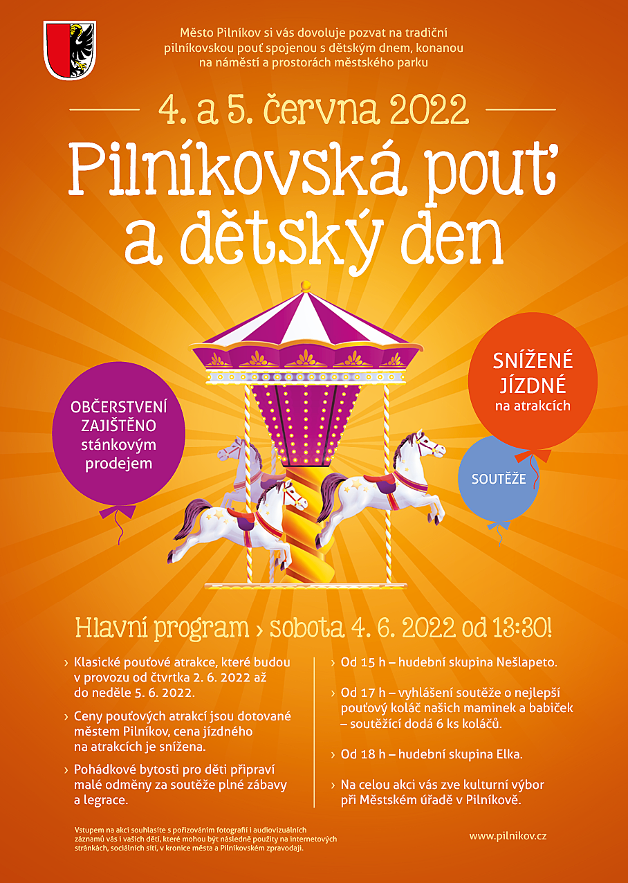 Vedení města Pilníkov si vás dovoluje pozvat na tradiční pilníkovskou pouť, která se koná první víkend v červnu. Sobotní program zábavného odpoledne začíná od 13:30 hodin na náměstí, u kostela a v parku. Těšit se můžete na pouťové atrakce, dětské soutěže s pohádkovými bytostmi nebo soutěž o nejlepší pouťový koláč. Pouťové atrakce budou v provozu již od čtvrtka 2. 6. 2022, cena jízdného na atrakcích je dotována městem Pilníkov.