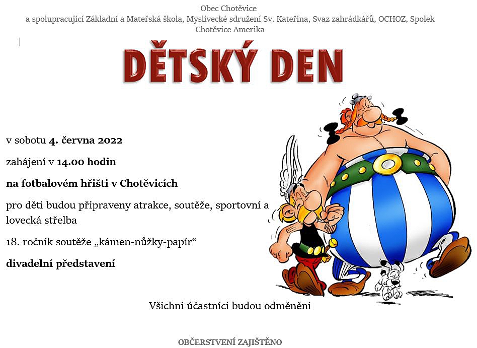 Zveme všechny děti a jejich rodiče na Dětský den, který se koná v sobotu 4. 6. 2022 od 14:00 na fotbalovém hřišti