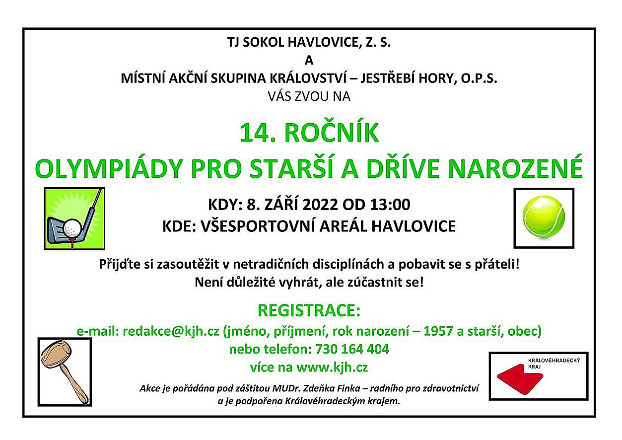 Rádi bychom Vás pozvali na připravovanou akci – Olympiáda pro starší a dříve narozené. Letošní již čtrnáctý ročník se opět bude konat na začátku září v havlovickém Všesportovním areálu. Pro tento rok bylo zvoleno datum 8. září 2022 a začátek akce je stanoven na 13 hodin. Olympiády se mohou zúčastnit senioři s rokem narození 1957 a starší. Vzhledem k zaměření Místní akční skupiny Království – Jestřebí hory, o. p. s. nabízíme zájemcům svoz i odvoz z našeho regionu zdarma - trasa, časy i místa zastávek budou již jsou známy. V případě, že jste se nestihli předem registrovat, rádi Vás i tak v Havlovicích uvítáme a zaregistrujeme až na místě.