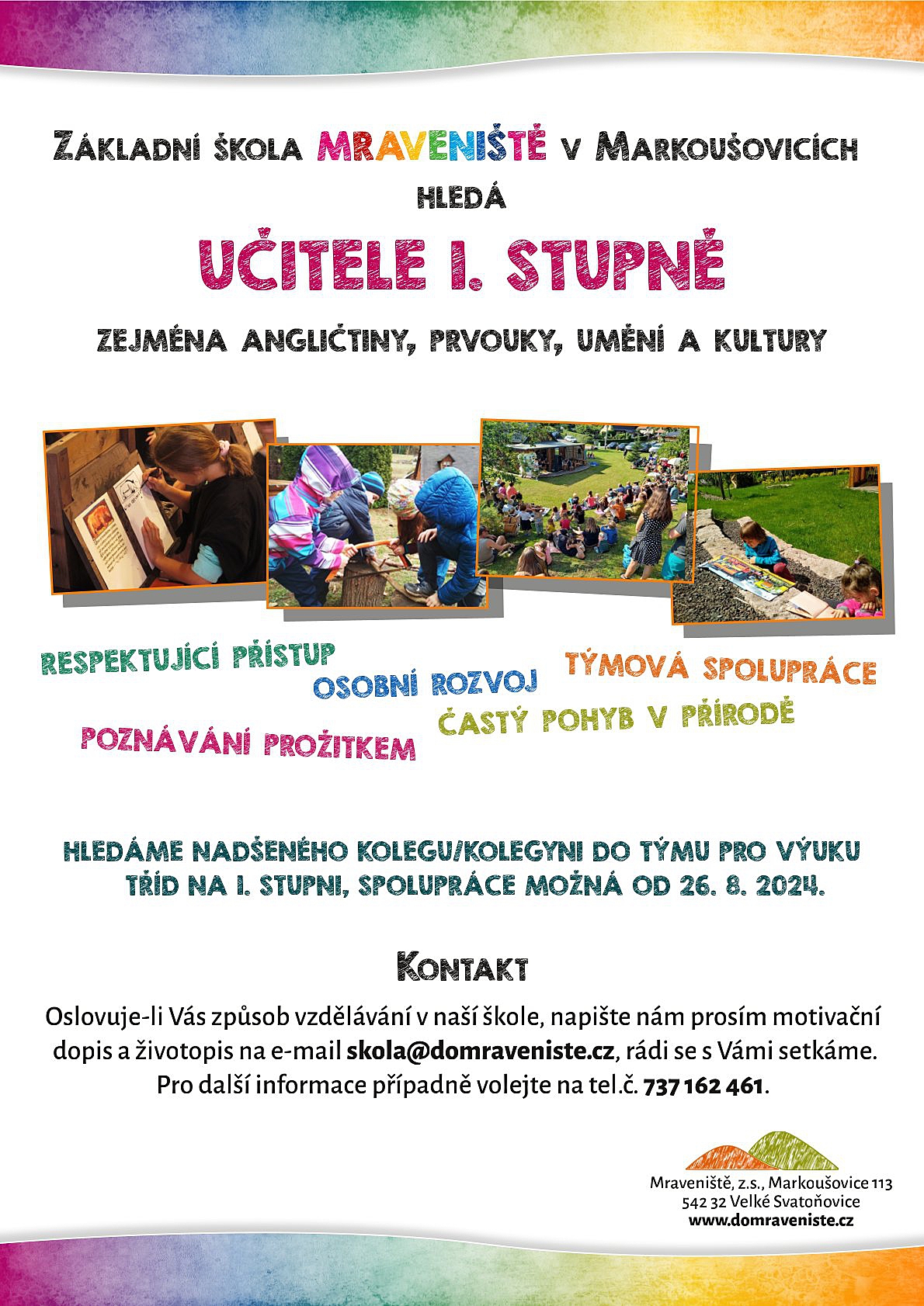 Základní škola Mraveniště v Markoušovicích hledá učitele 1. stupně (zaměření angličtina, prvouka, umění a kultura).