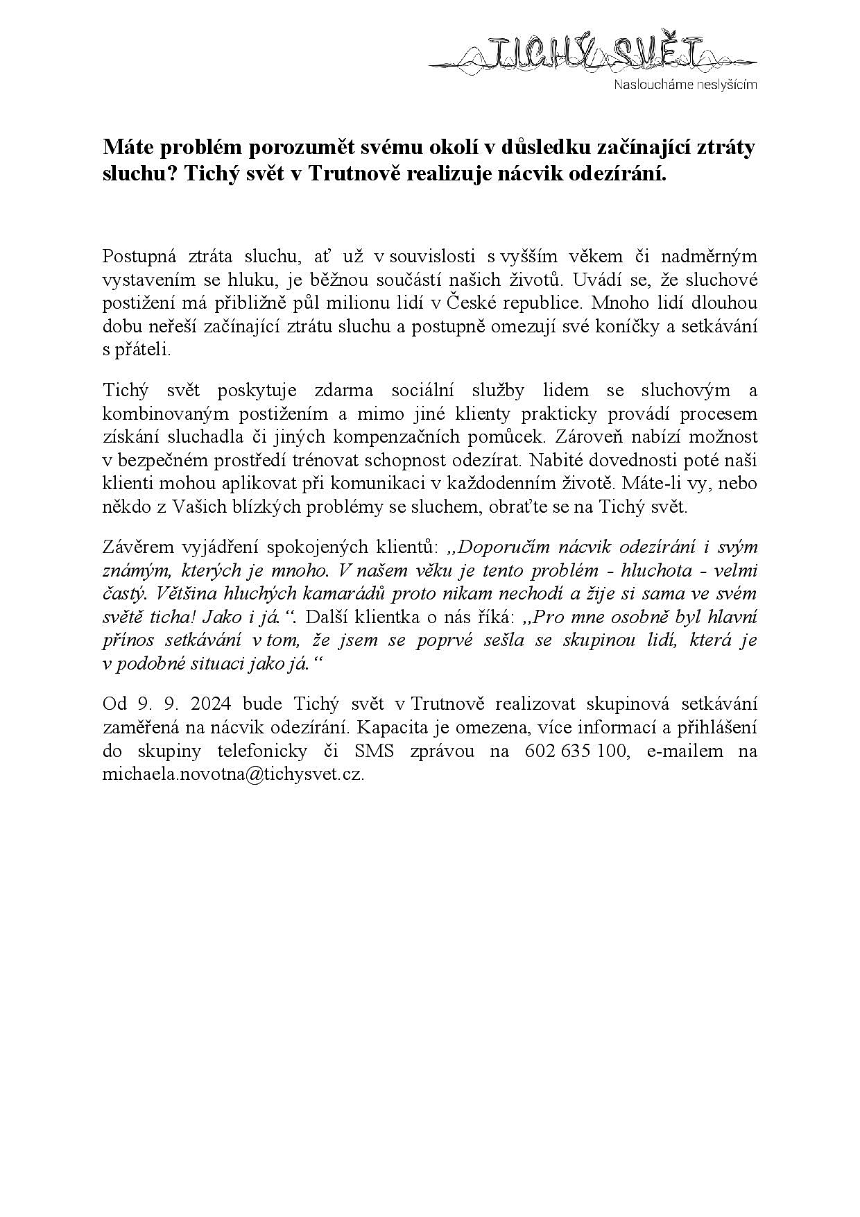 Tichý svět, o.p.s. bude od 09.09.2024 v Trutnově realizovat skupinová setkávání zaměřená na nácvik odezírání.