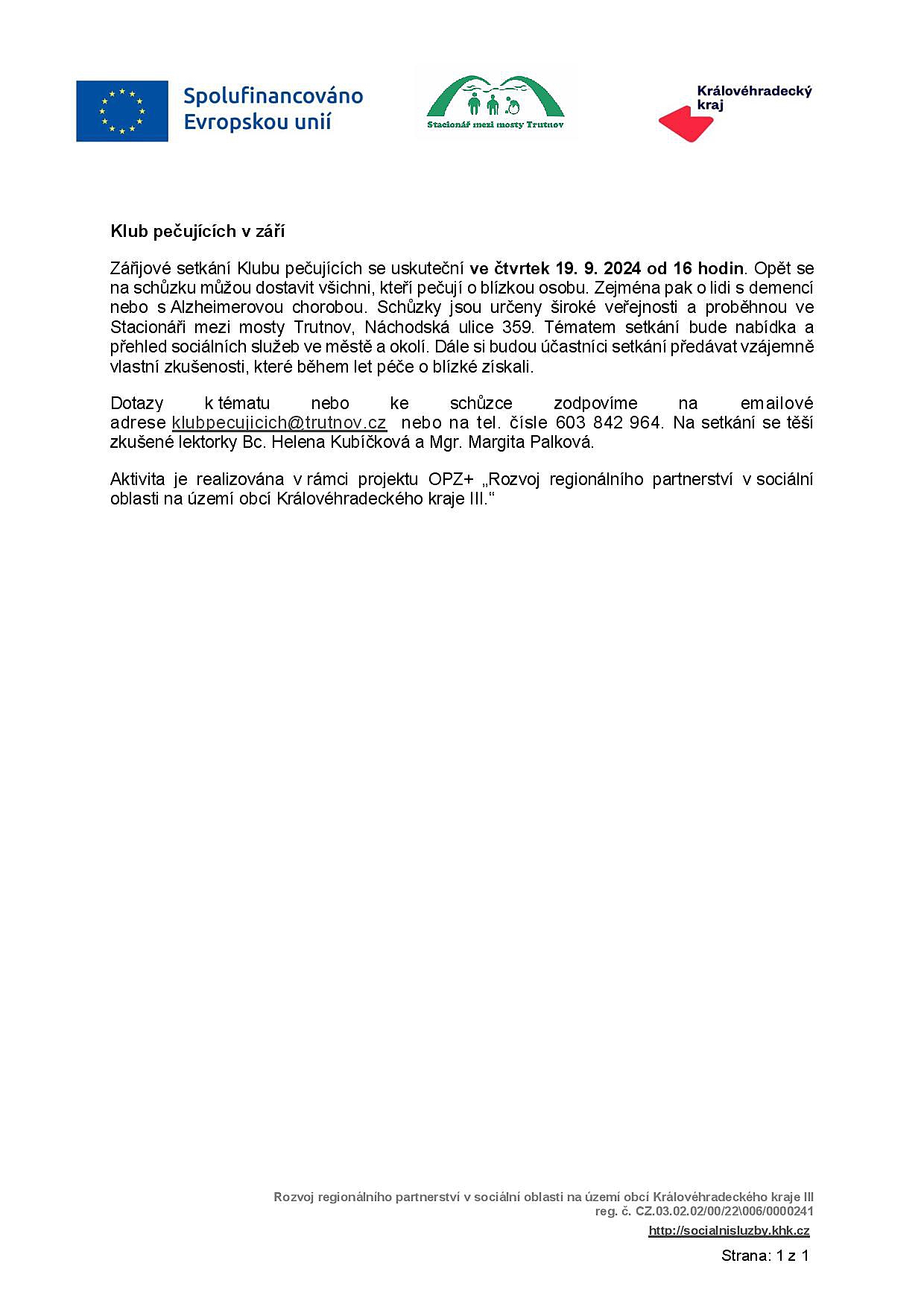 Zářijové setkání Klubu pečujících se uskuteční ve čtvrtek 19.09.2024 od 16 hodin ve Stacionáři mezi mosty Trutnov.