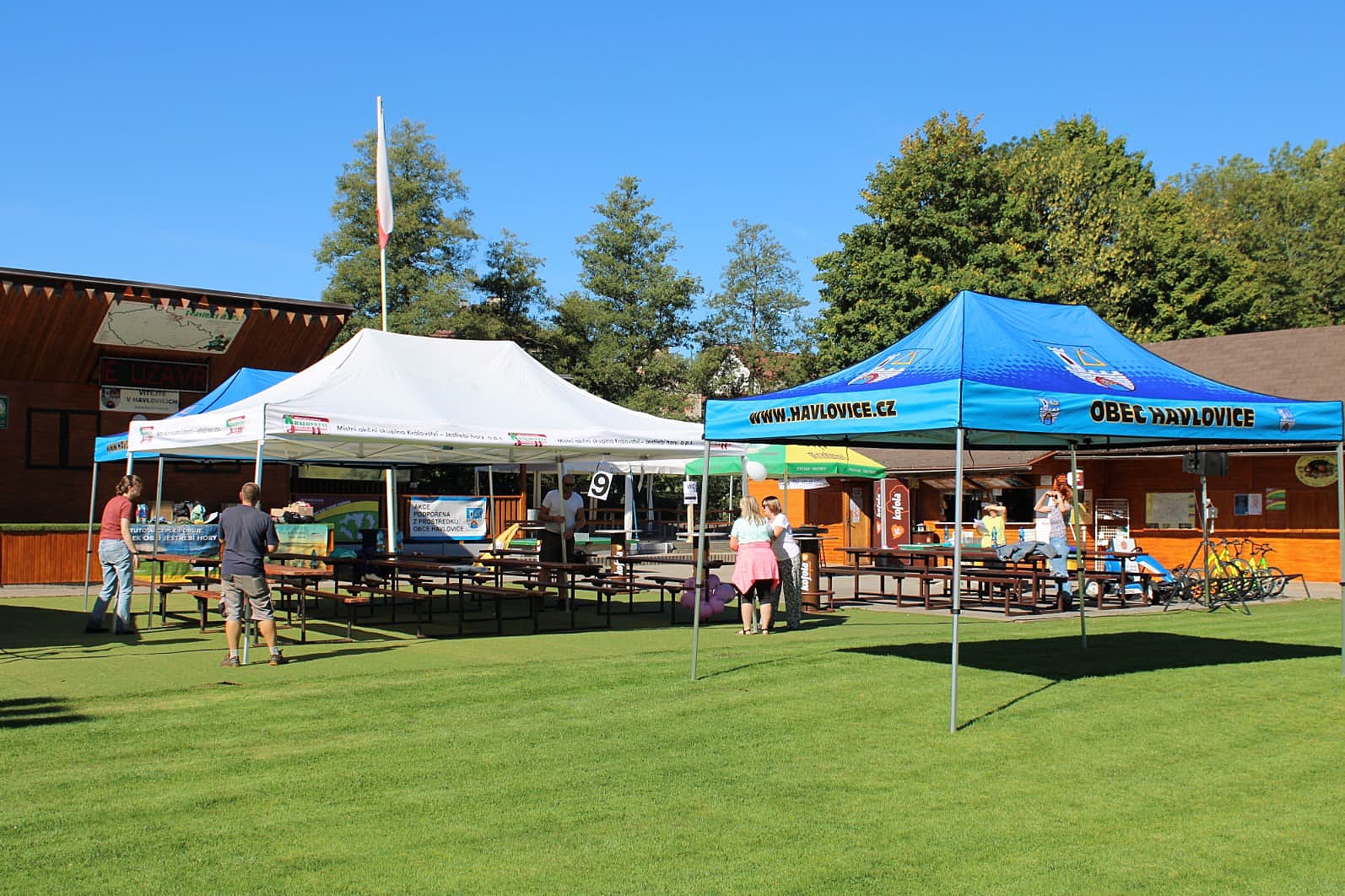 Základním kamenem celého odpoledne je vytvořit v areálu pro všechny seniory komfortní sezení ve stínu. A věřte, je to pěkný oříšek. Nezištně ho pomáhají rozlousknout Sbory dobrovolných hasičů z Úpice a Havlovic, které ve svém volném čase přivážejí, staví, bourají, a zase odvážejí. Stany i lavice. Stany zdarma letos zapůjčila i Obec Havlovice.