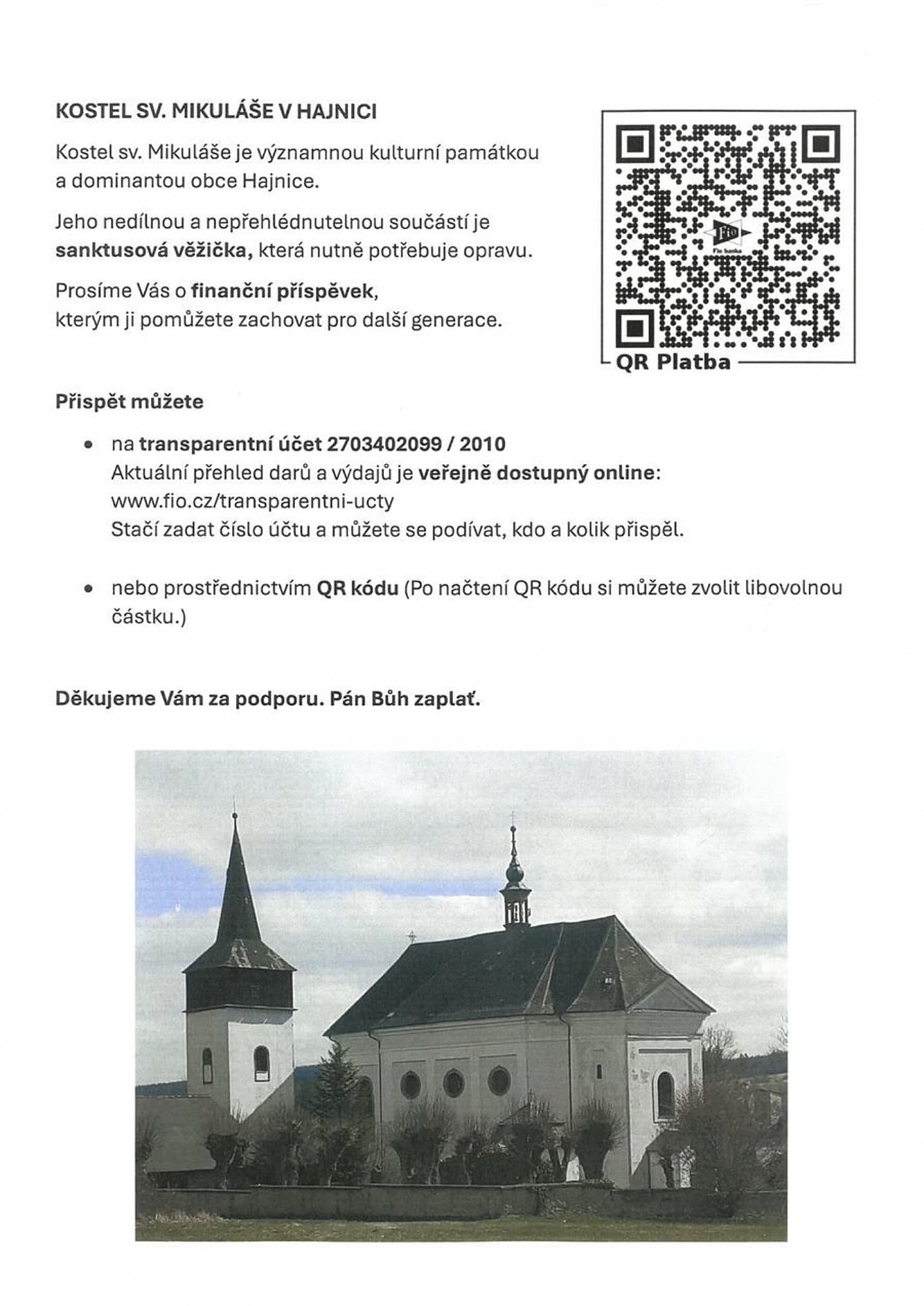 Kostel sv. Mikuláše v Hajnicích je významnou kulturní památkou a dominantou obce. Nedílnou součástí kostela je také sanktusová věžička, která je dnes ve špatném technickém stavu a nutně potřebuje opravu.