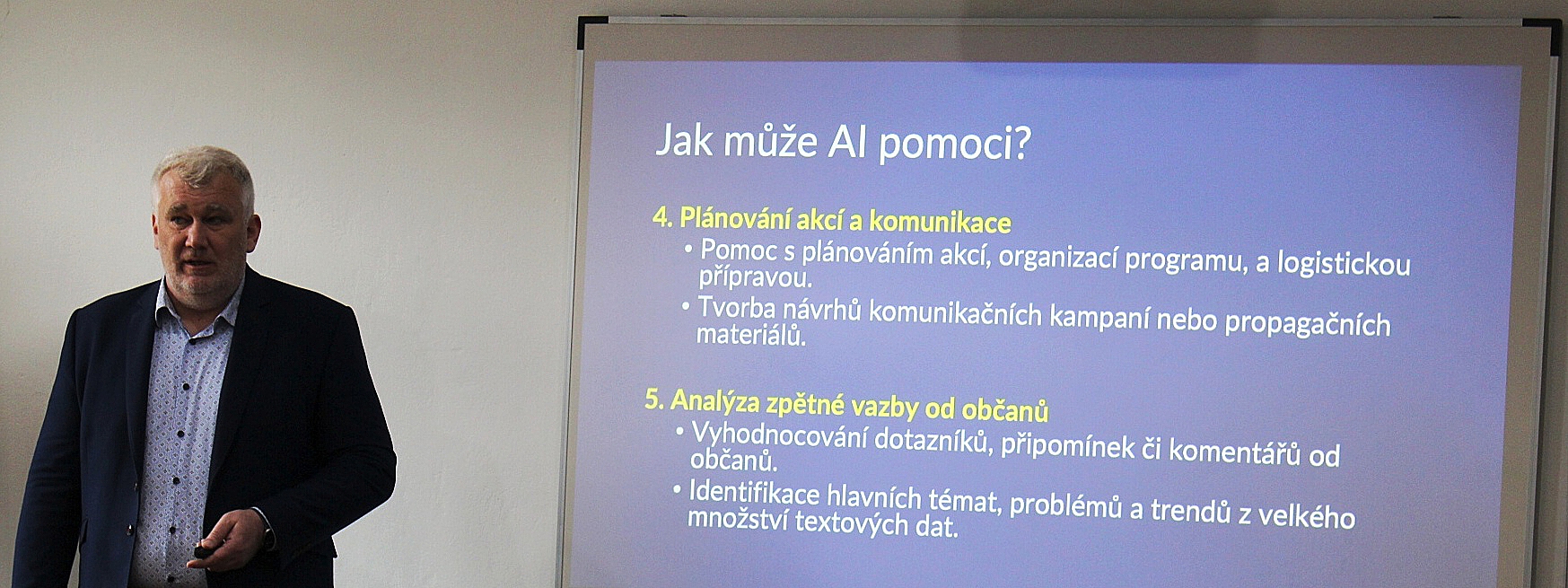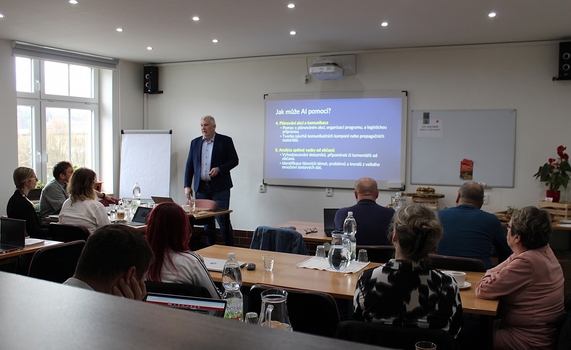 Celkem 16 zástupců místních samospráv pozdravil v úvodu ředitel MAS Jan Balcar, který mimo jiné informoval o rozjíždějícím se projektu „Rozvoj komunity v území MAS Království - Jestřebí hory, o.p.s.“. Pak už následovalo zajímavé školení o umělé inteligenci, které dalším městům a obcím v MAS zprostředkoval Pilníkov. Toto město vyhrálo Oranžovou stuhu v celostátním finále soutěže Vesnice roku a jedním z benefitů bylo, že mohlo do území přivést atraktivní prezentaci možností AI. Školení Jaromíra Poláška účastníkům přiblížilo nejen dynamický vývoj umělé inteligence, ale především její konkrétní přínosy pro práci starostů a obecních úřadů. Ve své prezentaci se lektor poutavým způsobem věnoval otázkám budoucnosti AI, možnostem jejího praktického využití při správě obcí i širší debatě o tom, zda může umělá inteligence v některých oblastech nahradit lidskou práci.