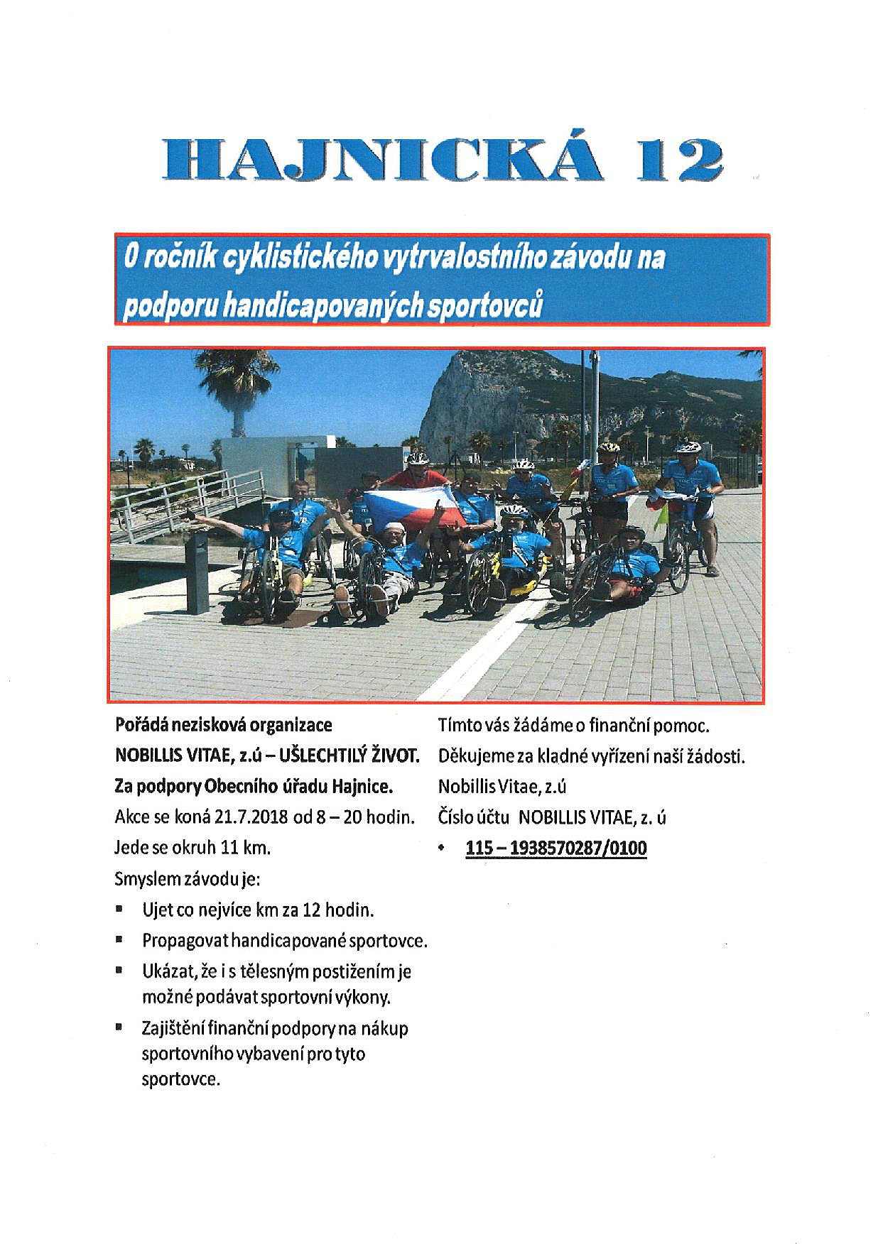 Dne 21. 7. 2018 od 8:00 do 20:00 proběhne Hajnická 12. Závod jehož smyslem je ujet co nejvíce kilometrů za 12 hodin a tímto sportovním výkonem dokázat, že i handicapovaní mohou podávat sportovní výkony. Akci pořádá NOBILLIS VITAE, z.s. - UŠLECHTILÝ ŽIVOT za finanční podpory obce Hajnice. Prosíme vás všechny o finanční podporu této akce. Číslo účtu a bližší informace najdete na plakátu.