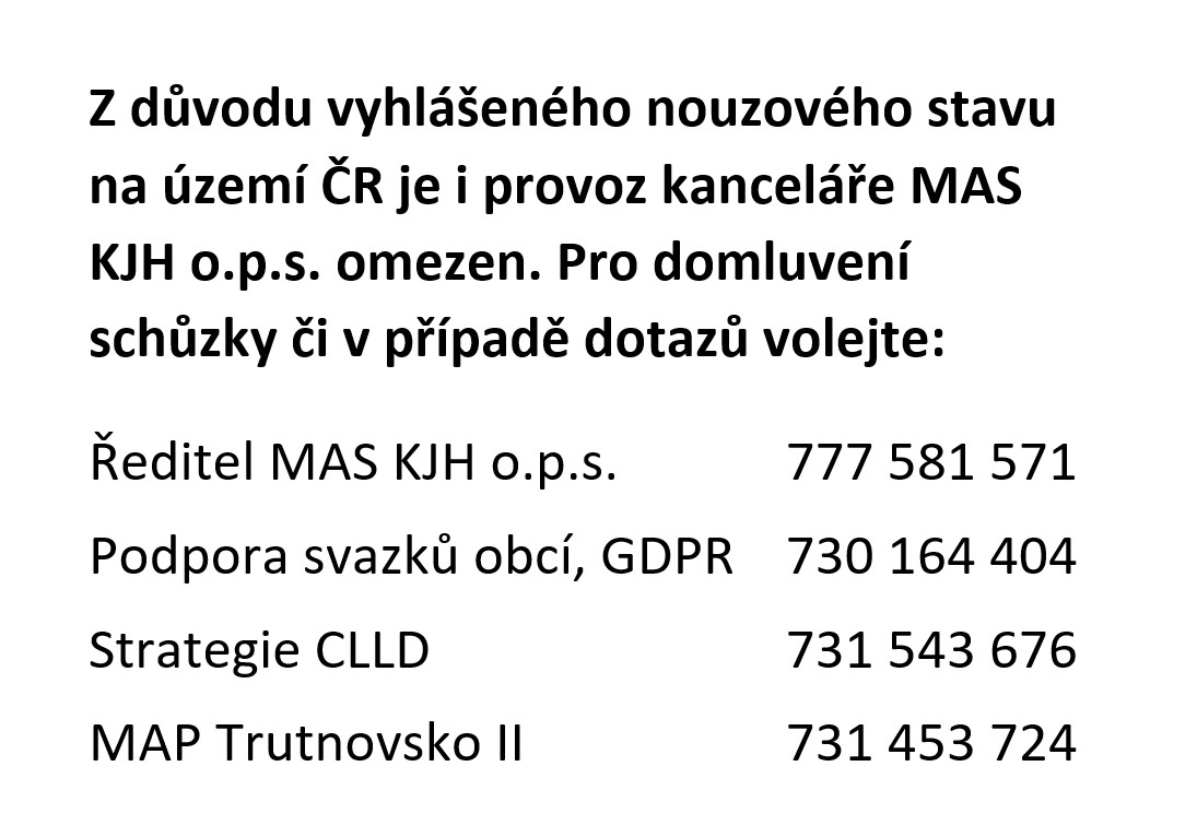 S ohledem na vyhlášený nouzový stav na území ČR přistoupila i Místní akční skupina Království - Jestřebí hory, o.p.s. k preventivnímu opatření. Tím je omezení provozu kanceláře a výkon zaměstnání převážně z domova. Jsme ale k zastižení na pracovních telefonech, jejich přehled je v příloze.