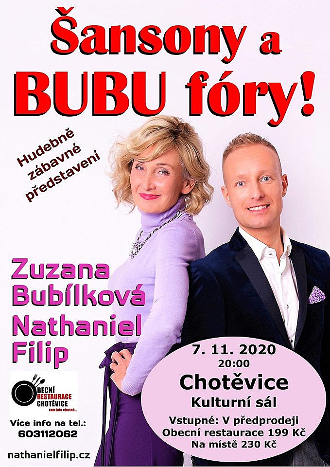 pokud jste si zakoupili vstupenky na představení ŠANSONY A BUBU FÓRY, které se mělo konat 16.5.2020, oznamuje Vám nyní, že jsme byli nuceni toto představení přesunout na 7.11.2020.