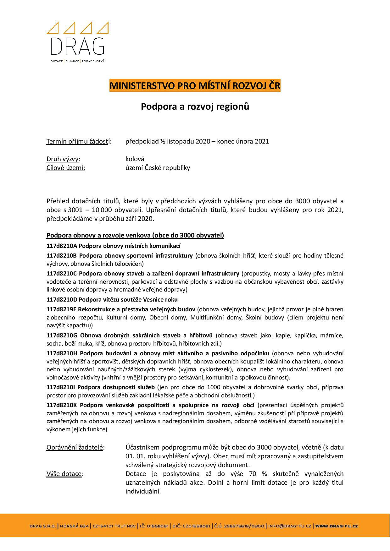 Také v letošním roce očekáváme vyhlášení výzvy v dotačním programu Podpora a rozvoj regionů 2021. Vzhledem k aktuální situaci jsme přesvědčeni, že letos bude v rámci daného titulu vyhlášeno více dotačních titulů (A-K) a zároveň předpokládáme, že bude vyšší i alokace dané výzvy. I přesto, že výzva doposud nebyla vyhlášena, připravili jsme pro Vás přehled předpokládaných parametrů (více v přiloženém souboru). Předpokládám, že podmínky dotačního titulu Vám jsou dobře známy, přesto se pokusím vypíchnout pár detailů, respektive navrhnut možný harmonogram realizace: 09/2020 – konzultace záměrů, 10-11/2020 – vyhlášení výzvy (řešení konkrétních podkladů), 11/2020 – 02/2021 – podání žádosti. V případě Vašeho zájmu o přípravu některého z Vašich projektů do daného dotačního titulu nás prosím kontaktujte (Michal Hátle, Lenka Skrbková).