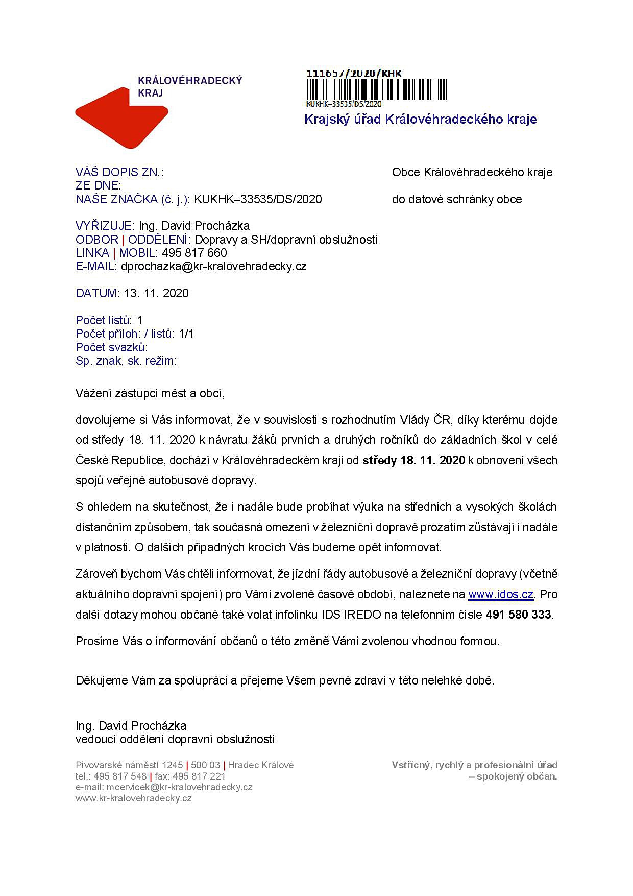 Královéhradecký kraj od středy 18. listopadu obnoví spoje veřejné autobusové dopravy, které dočasně omezil z důvodu uzavření škol kvůli pandemii koronaviru.