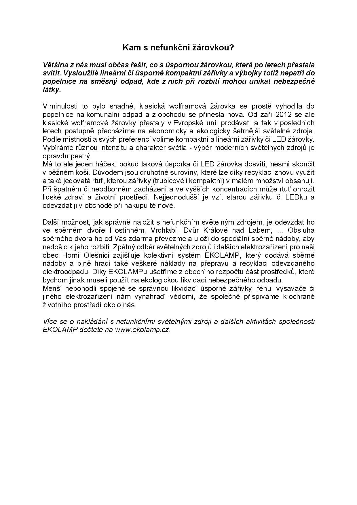 Řada z nás musela v poslední době doma řešit, co s úspornou zářivkou, která po letech přestala svítit. Vysloužilé lineární či úsporné zářivky a výbojky totiž nepatří do popelnice na směsný odpad, kde z nich při rozbití mohou unikat nebezpečné látky. Více se o nakládání s nefunkčními světelnými zdroji a dalších aktivitách společnosti EKOLAMP dočtete na www.ekolamp.cz.