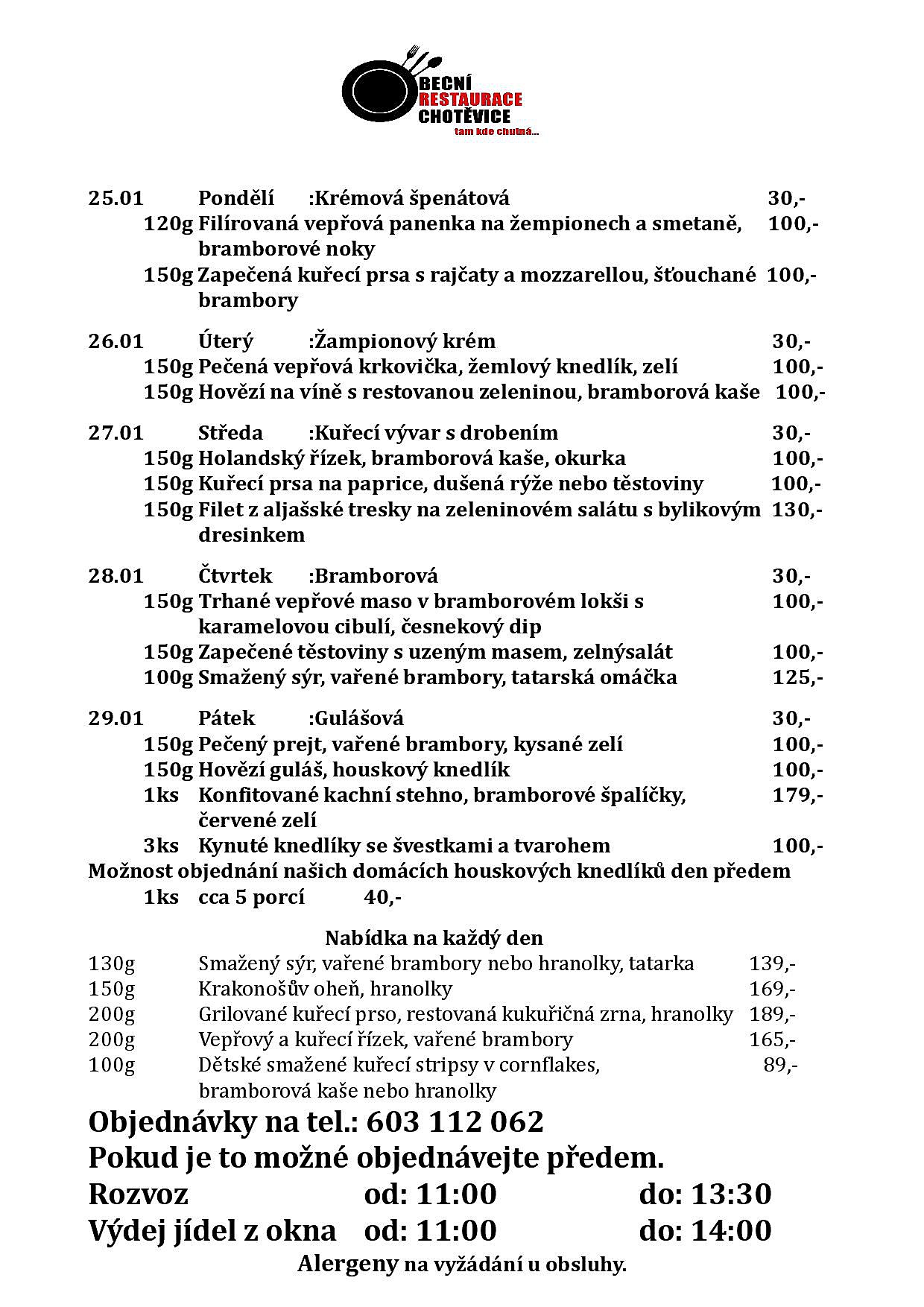 Jídelní lístek Obecní restaurace Chotěvice 25.01.2021 - 29.01.2021