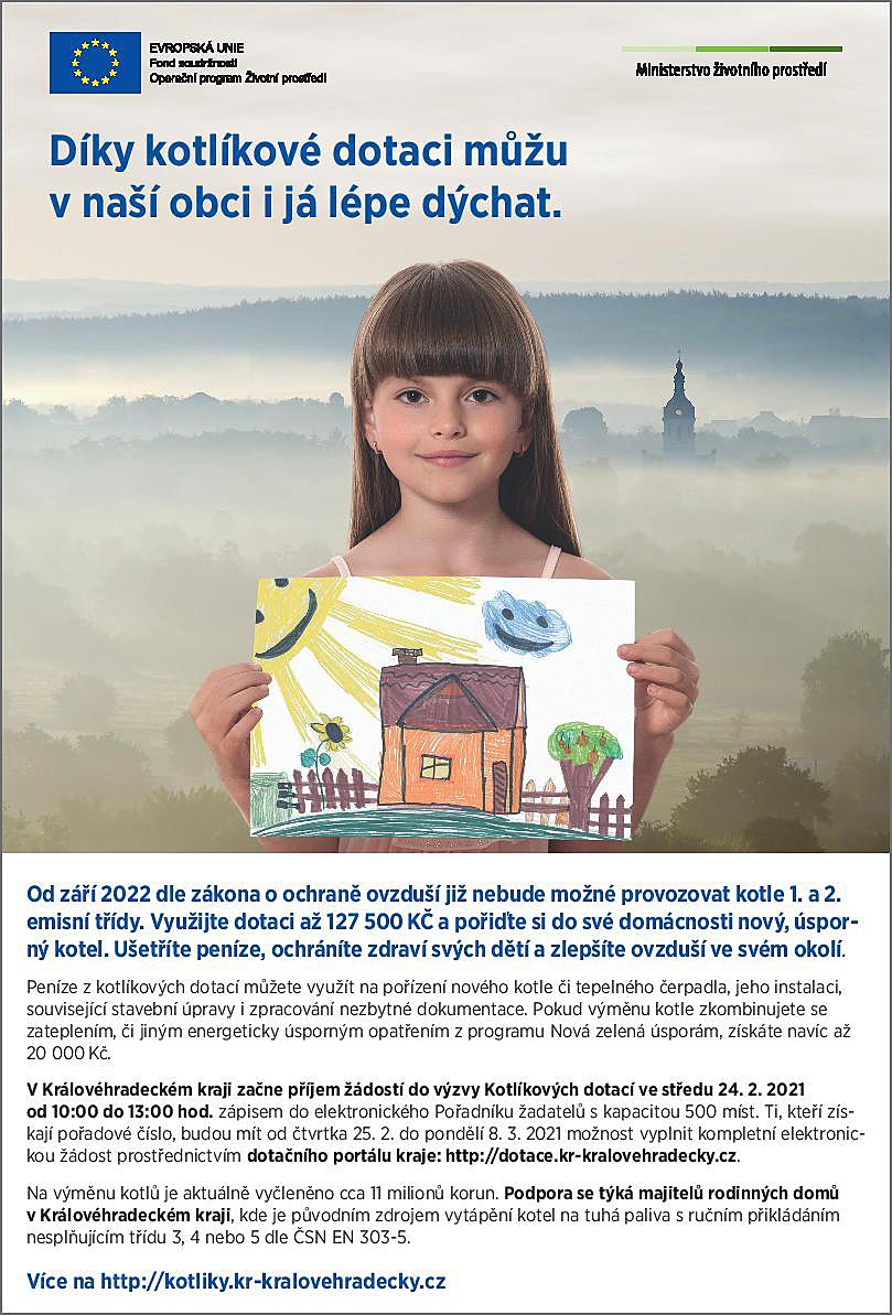 Od září 2022 dle zákona o ochraně ovzduší již nebude možné provozovat kotle 1. a 2. emisní třídy. Využijte dotaci až 127 500 KČ a pořiďte si do své domácnosti nový, úsporný kotel. Ušetříte peníze, ochráníte zdraví svých dětí a zlepšíte ovzduší ve svém okolí.