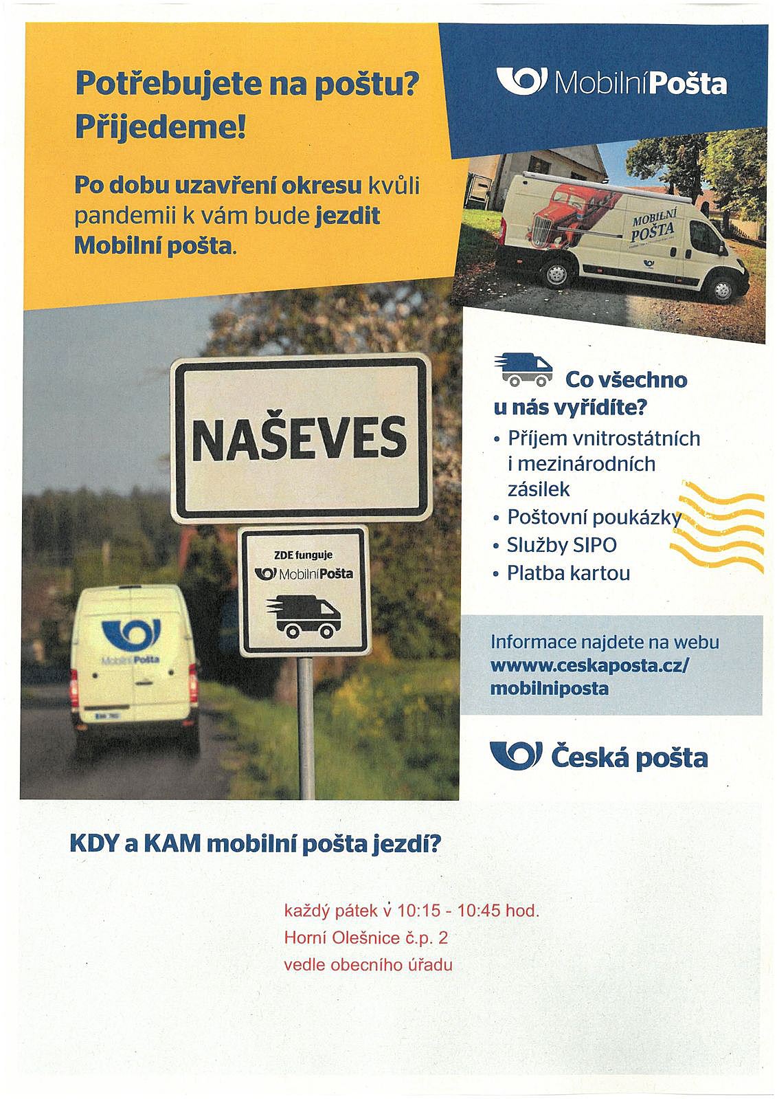 Po dobu uzavření okresu kvůli pandemii bude do obce Horní Olešnice zajíždět mobilní pošta.