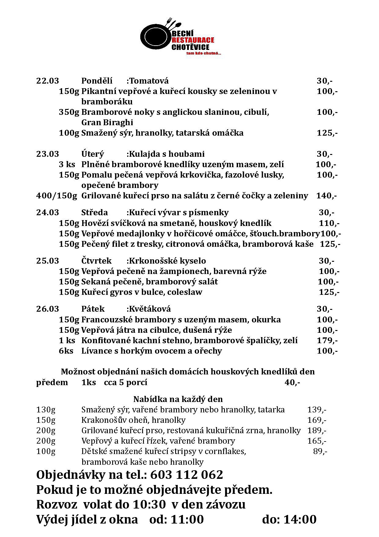Jídelní lístek Obecní restaurace Chotěvice 22.03.2021 - 26.03.2021