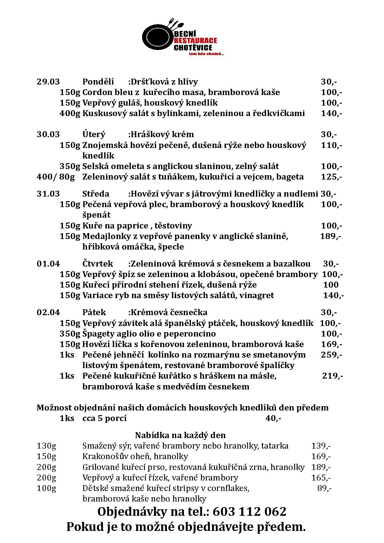 Jídelní lístek Obecní restaurace Chotěvice 29.03.2021 - 02.04.2021