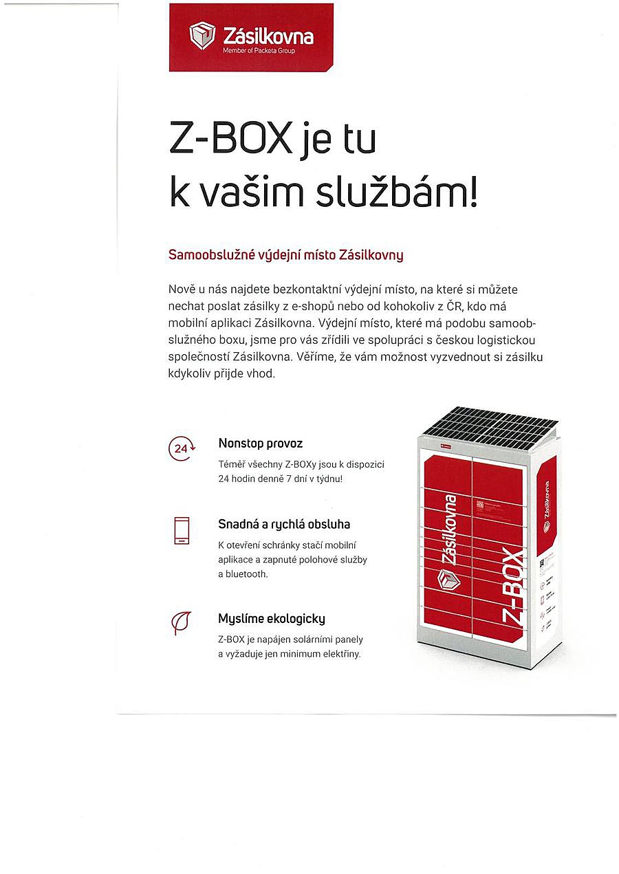 Zákazníci Zásilkovny si budou moci vyzvednout své zásilky objednané na internetu v Z-BOXu na parkovišti u obecního úřadu.