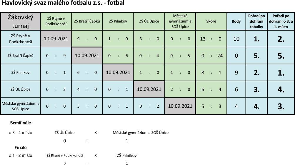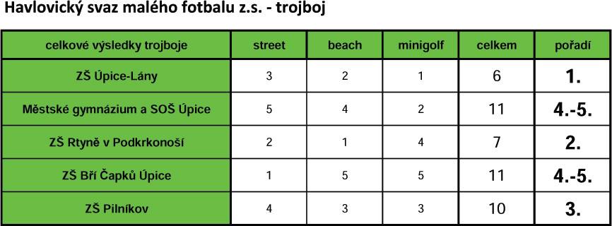 V trojboji obhájila prvenství Základní škola Úpice-Lány, na druhém místě se celkově umístila ZŠ a ZUŠ Rtyně v Podkrkonoší a na místě třetím ZŠ Pilníkov. V minikopané první místo obhájila ZŠ Pilníkov, 2. ZŠ a ZUŠ Rtyně v Podkrkonoší a 3. Gymnázium a SOŠ Úpice.