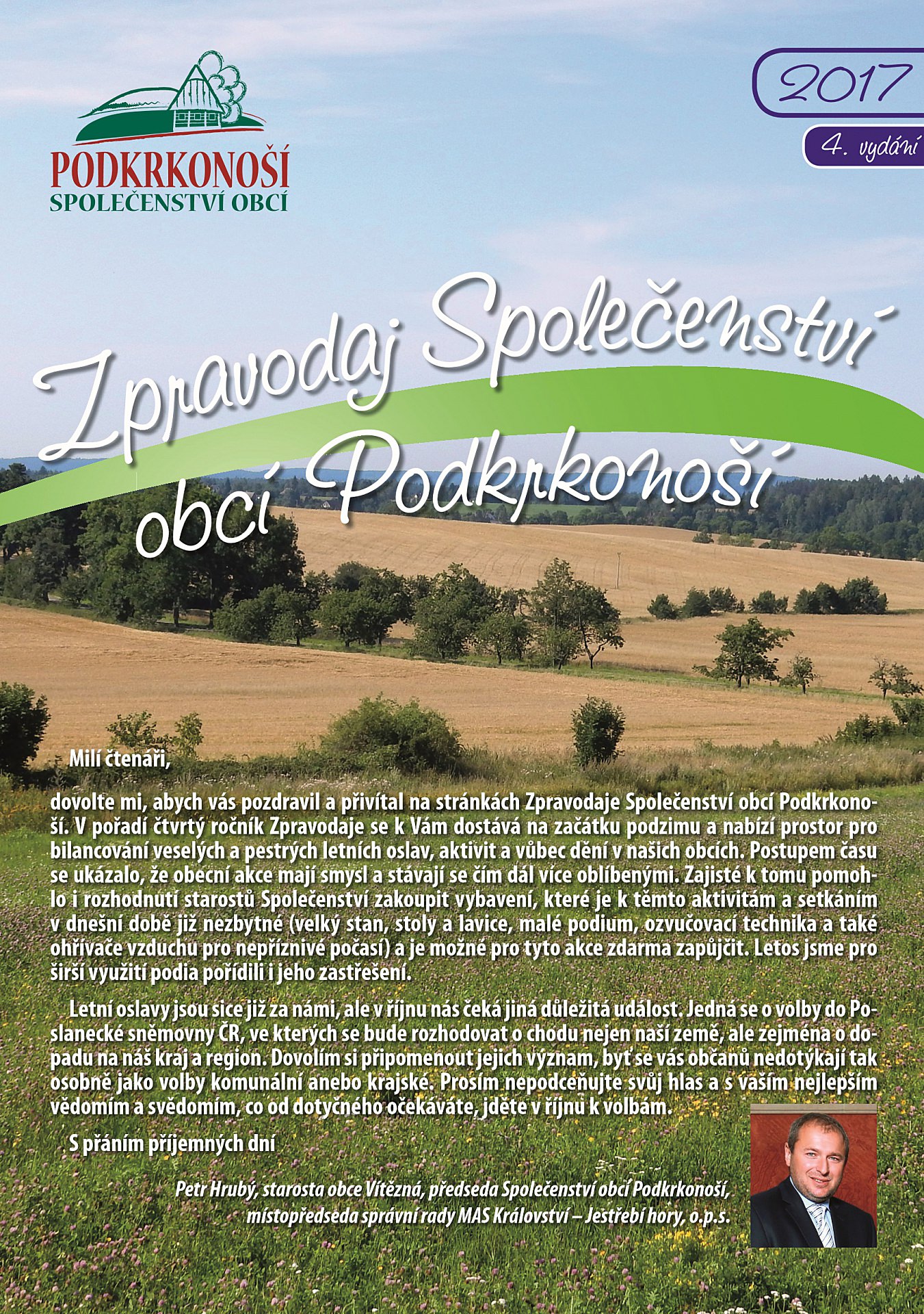 Společenství obcí Podkrkonoší vydalo pro své občany v pořadí již čtvrté číslo Informačního zpravodaje. Oproti minulému číslu, které bylo dostupné pouze v elektronické verzi, se ke čtenářům opět dostává tištěná podoba. Zpravodaj distribuují obce Společenství přímo do schránek svých občanů již v těchto dnech. „Pokud se stane, že Zpravodaj se k Vám nedostane, neváhejte se obrátit na místní obecní úřad, kde bude vždy několik čísel navíc,“ dodává předseda Společenství Petr Hrubý. Pevně věříme, že se podzimní vydání tohoto listu neztratí v předvolebních materiálech a vrátí čtenáře zpět do letních dnů svou rekapitulací obecních akcí, oslav a setkání.