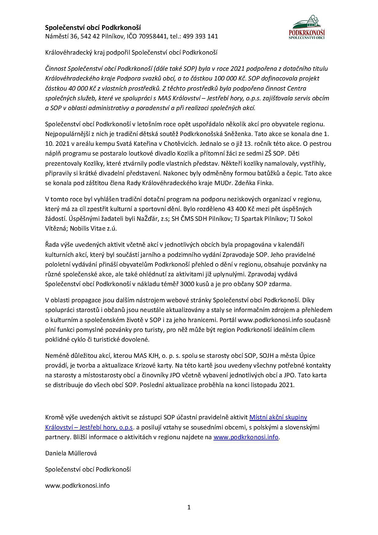 Činnost Společenství obcí Podkrkonoší (dále také SOP) byla v roce 2021 podpořena z dotačního titulu Královéhradeckého kraje Podpora svazků obcí.