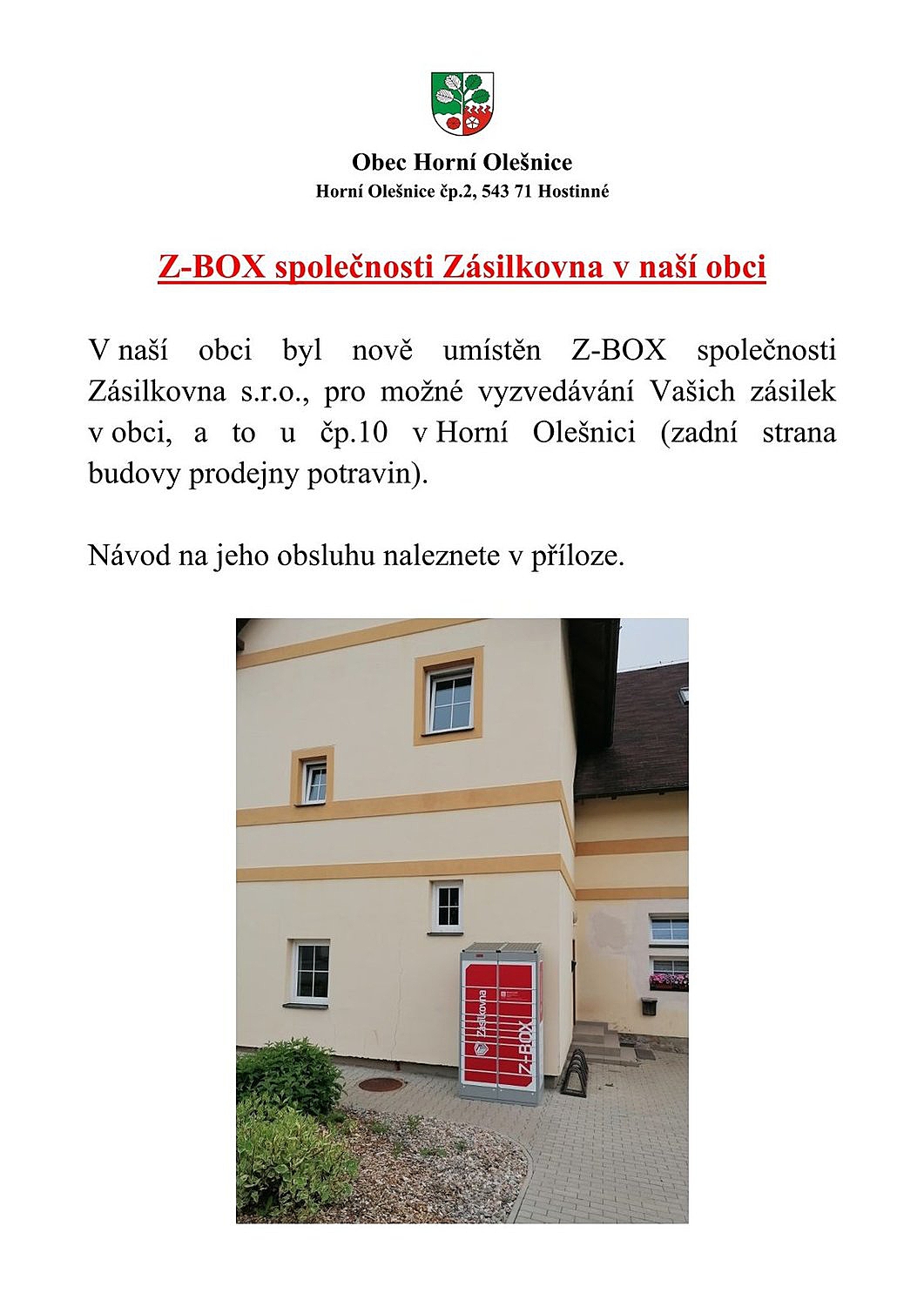 V obci Horní Olešnice byl nově umístěn Z-BOX společnosti Zásilkovna s.r.o.