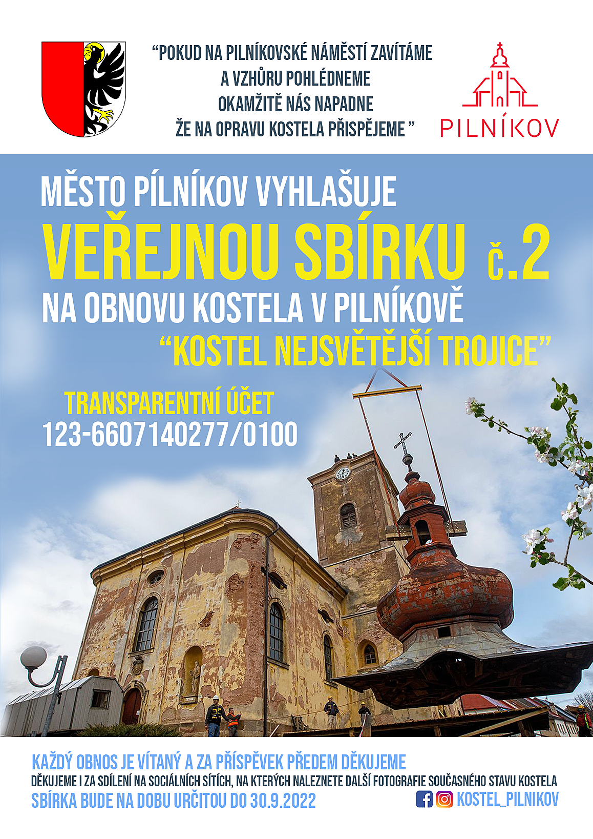 Proto Město Pilníkov oznámilo veřejnou sbírku pod názvem „Sbírka č. 2 na obnovu kostela v Pilníkově „KOSTEL NEJSVĚTĚJŠÍ TROJICE“, díky které se každý může podílet na shromáždění finančních prostředků k znovuobnovení památky.