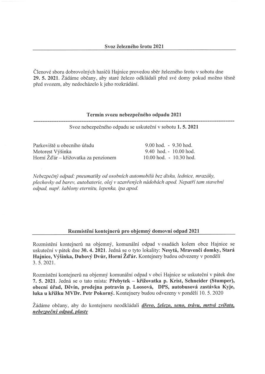 Svoz železného šrotu, nebezpečného a objemného odpadu