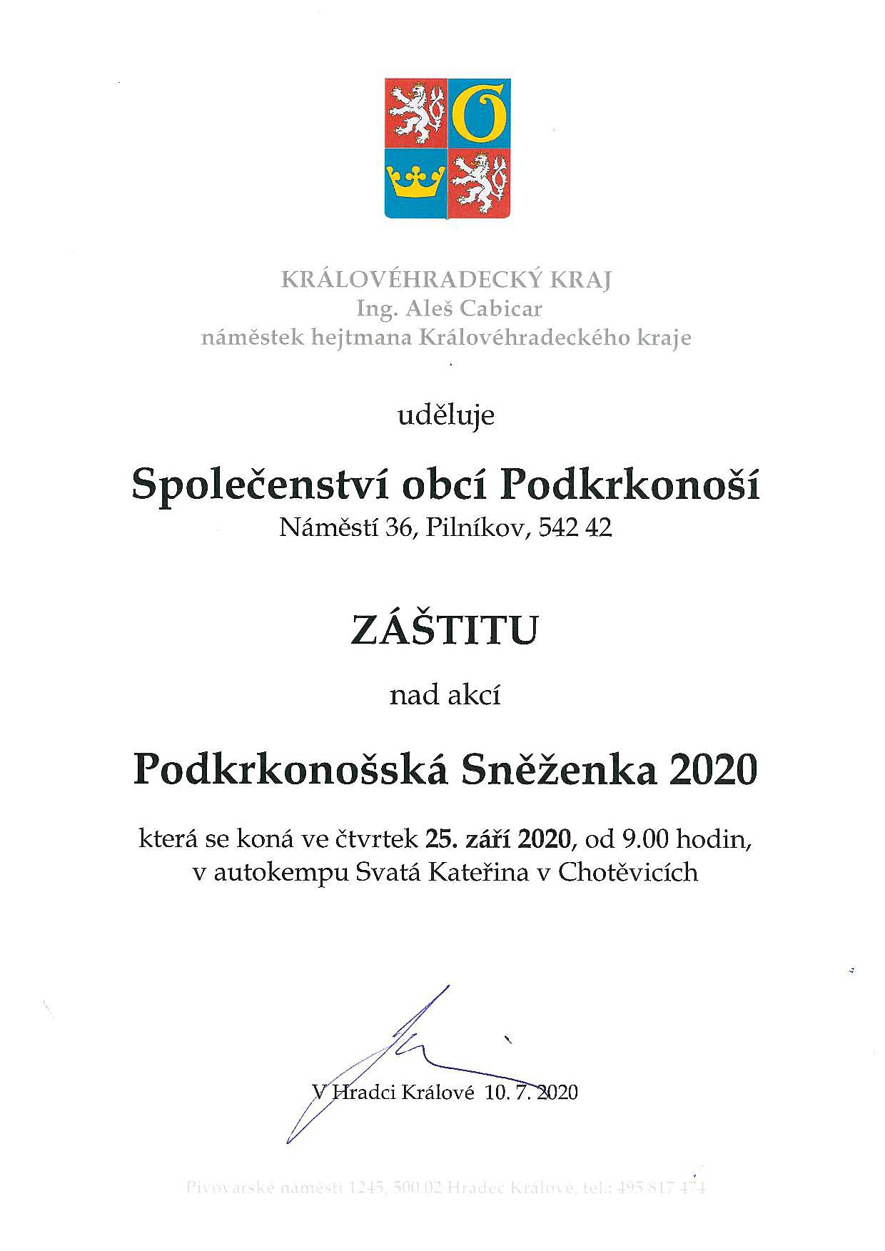 Setkání pro žáky sedmi základních škol "Podkrkonošská Sněženka" uspořádá 25. září 2020 Dobrovolný svazek obcí Společenství obcí Podkrkonoší. „Chtěli bychom poděkovat Královéhradeckému kraji, který naši tradiční akci podpořil. Také nás těší, že záštitu nad letošní Podkrkonošskou Sněženkou převzal Aleš Cabicar, náměstek hejtmana kraje pro oblast zdravotnictví,“ neskrývá svou spokojenost Petr Hrubý, předseda Společenství obcí Podkrkonoší. Letošní jubilejní 10. ročník Podkrkonošské Sněženky se uskuteční v autokempu Svatá Kateřina v Chotěvicích.