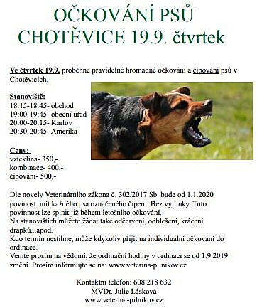 Ve čtvrtek 19. září 2019 proběhne na čtyřech stanovištích v obci Chotěvice pravidelné očkování a čipování psů. Rozpis stanovišť, časů a dalších informací naleznete na přiloženém plakátě.
